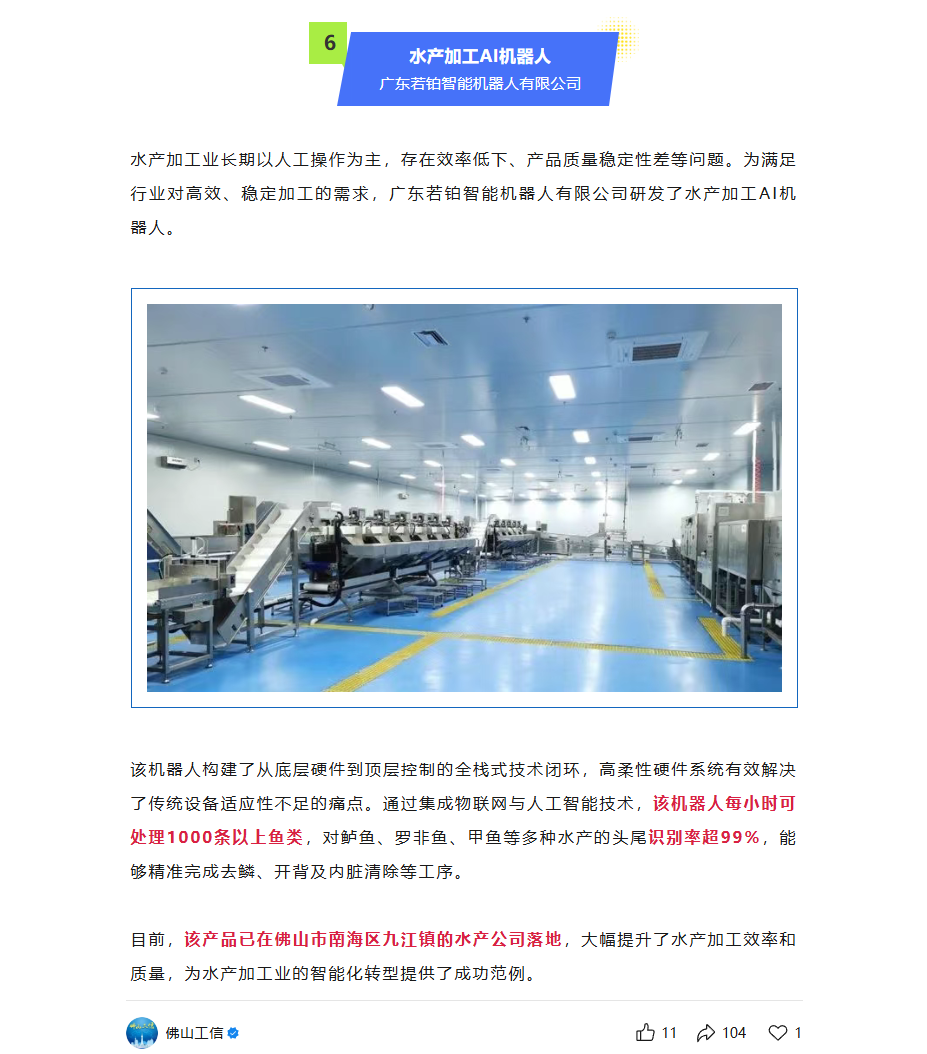 7月31日,广东若铂的水产加工AI机器人项目入选佛山市工业和信息化局发布的佛山市人工智能与智能机器人赋能重点行业优秀产品发布(第一批)。