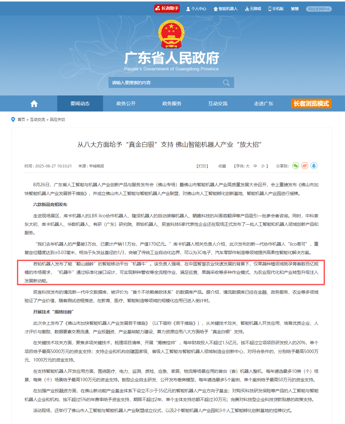 8月26日,广东省人工智能与机器人产业创新产品与服务发布会(佛山专场)暨佛山市智能机器人产业高质量发展大会,广东若铂发布了能“翻山越岭”的智能移动平台“机器牛”。在中国智慧农业快速发展的背景下,仅果蔬种植领域就孕育着数百亿规模的市场需求,“机器牛”通过标准化接口设计,可实现耕种管收等全流程作业,满足巡查、果蔬采收等多种作业模式,为农业现代化和产业转型升级注入发展新动能。